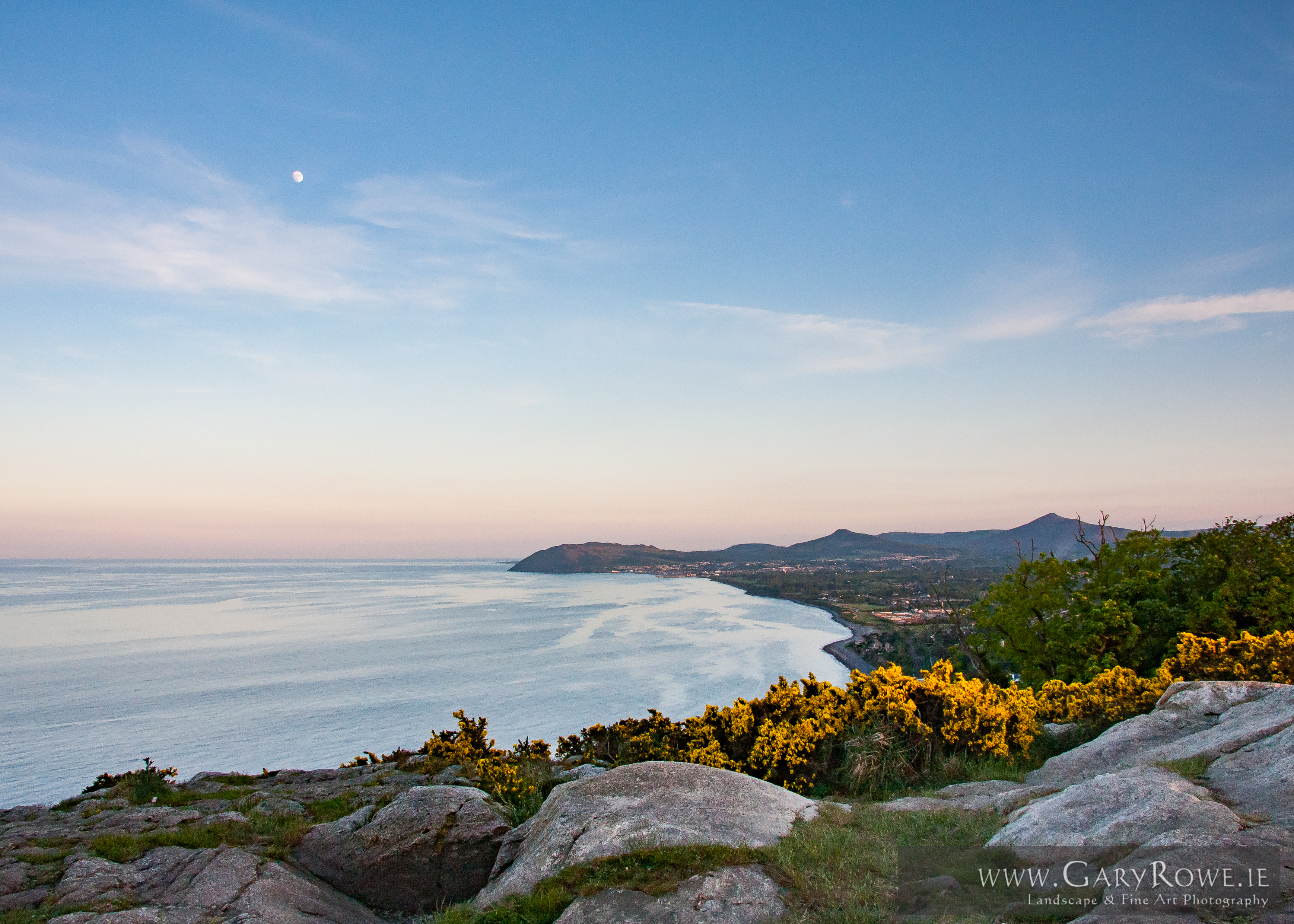 Evening light over Killiney hill, with Bray Head and the two Sugar Loaves in the distance