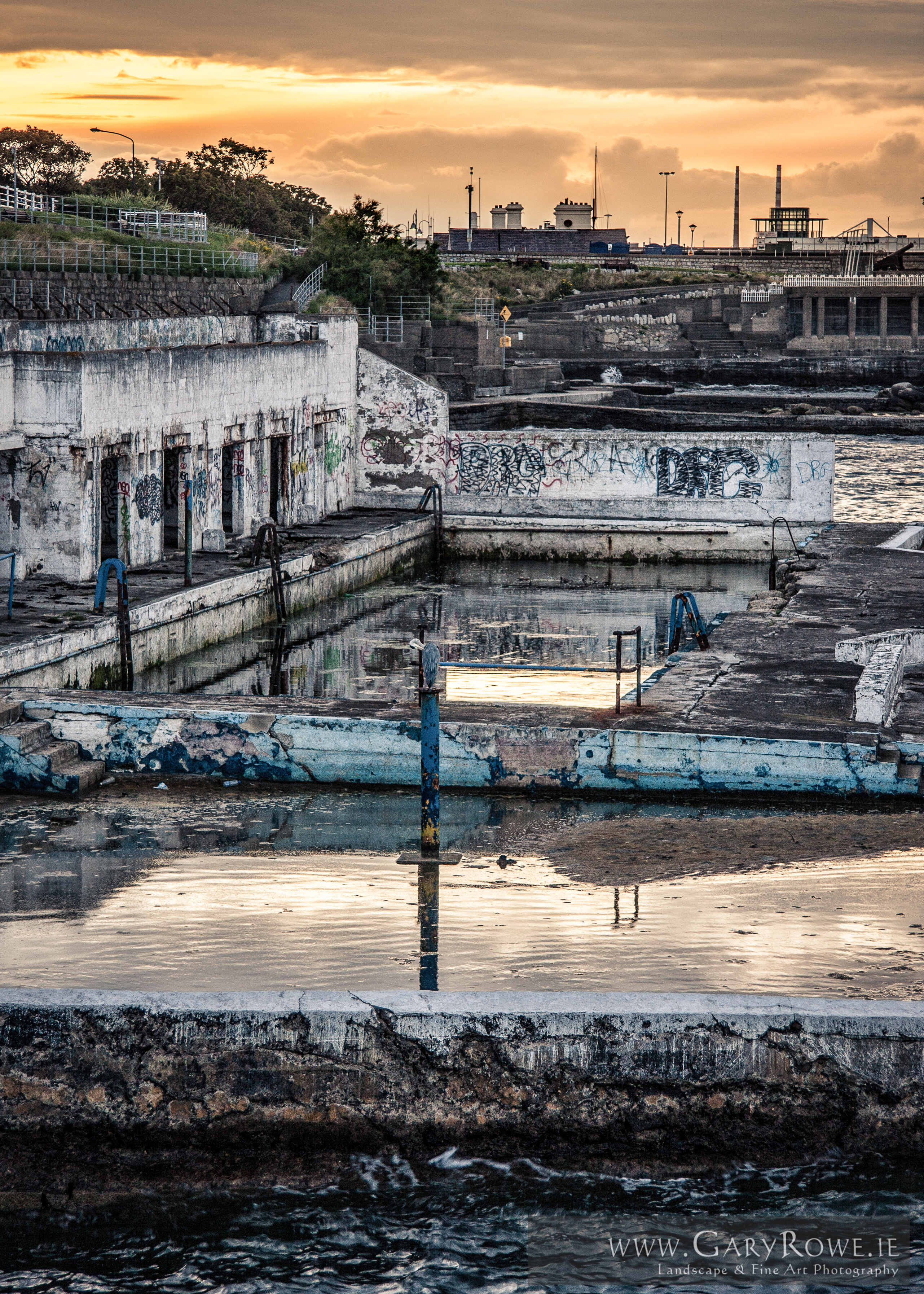The old Dun Laoghaire baths at sunset, from 2009, with the start of Dun Laoghaire pier in the background