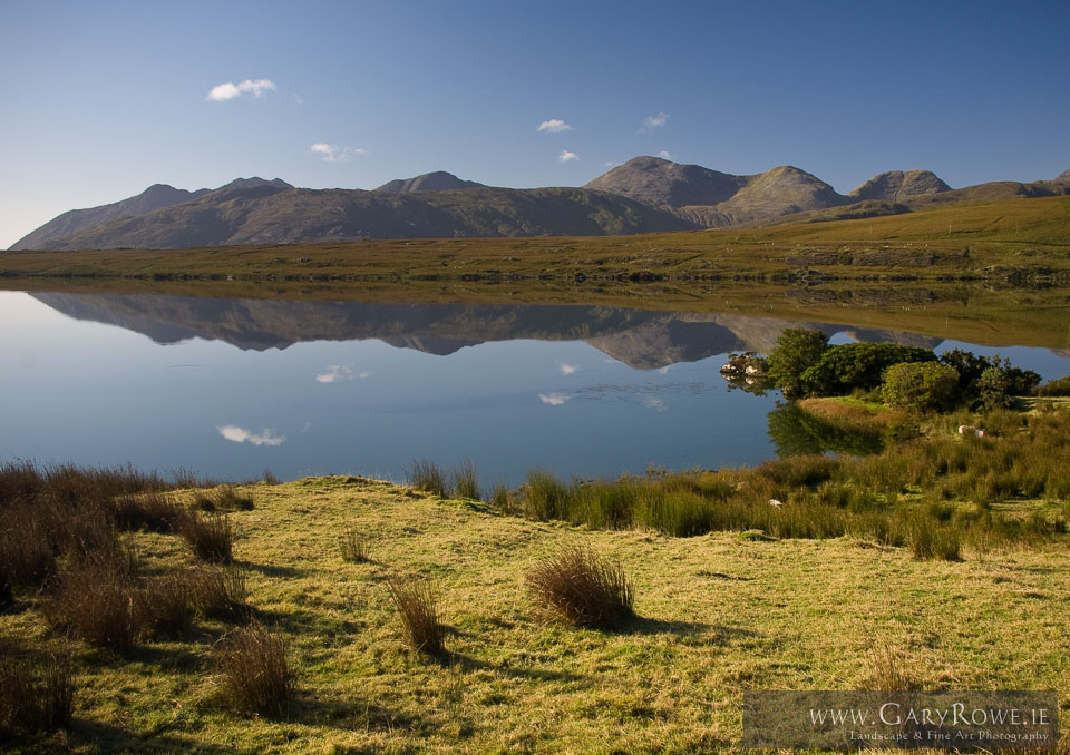Early morning reflections: a view of the twelve Bens visible from Lough Fee, Connamara