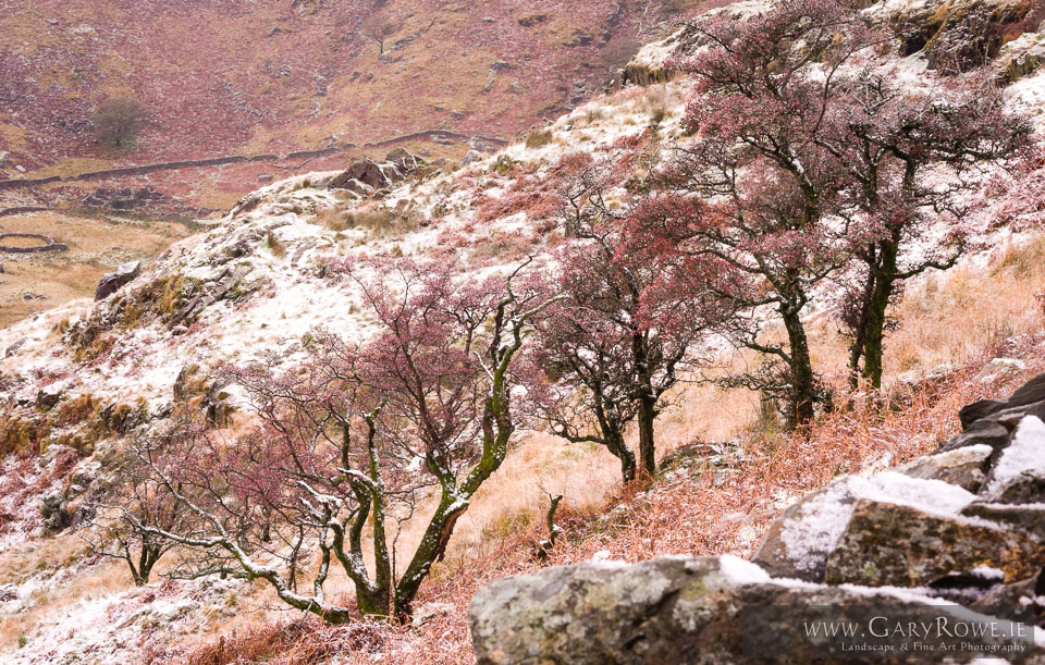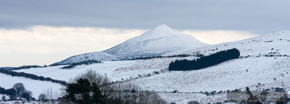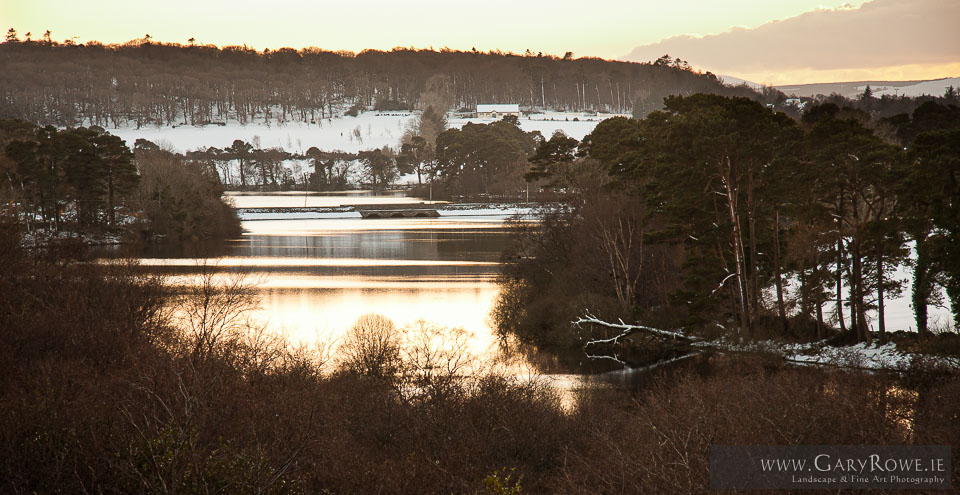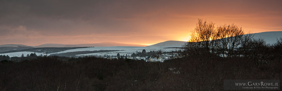 Sunset over snow-capped hills behinf Roundwood, viewed from Vartry Reservoir