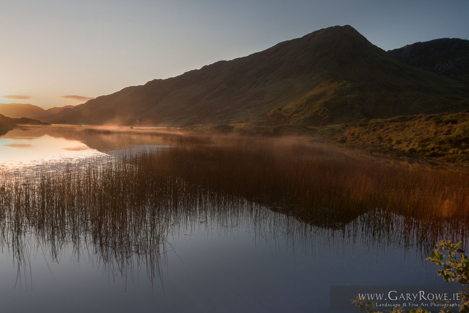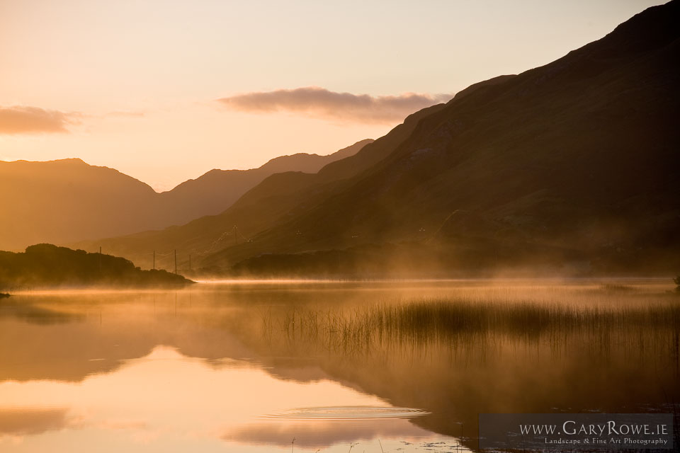 A cold sunrise over a warm lake by Kylemore Abbey, Connamara